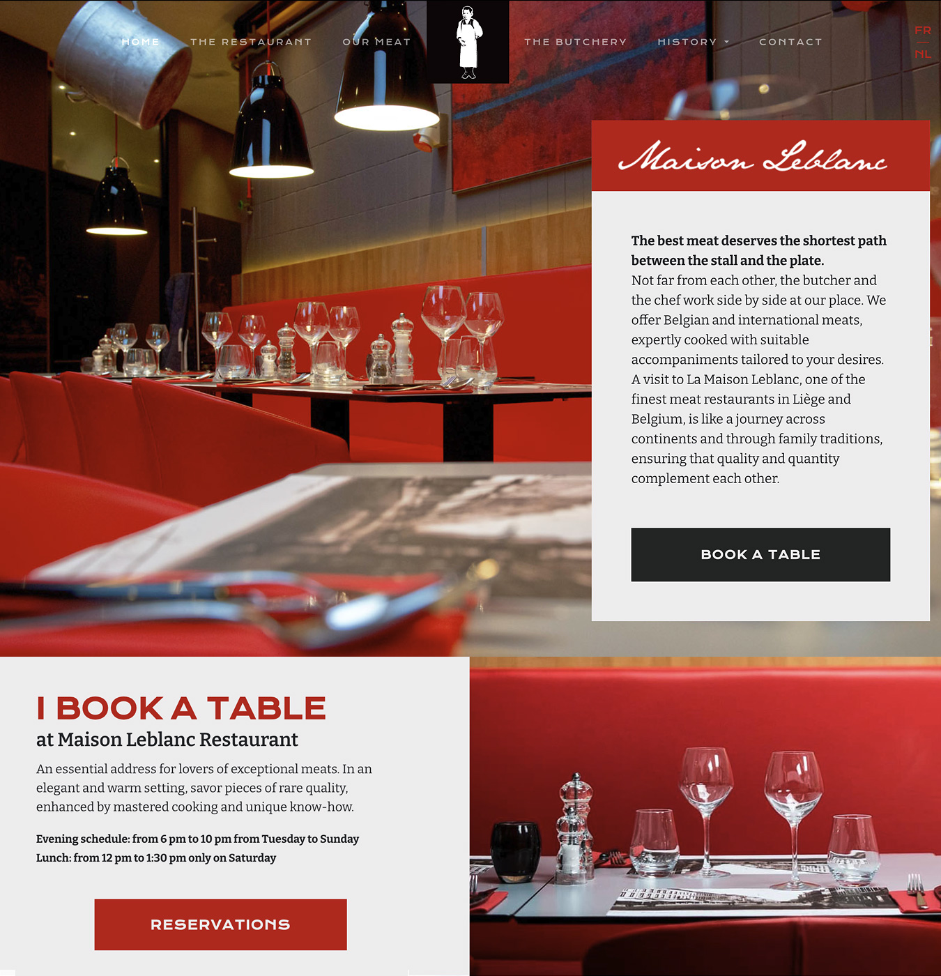 In 2013, the goal was to announce that the Maison Leblanc butcher shop was opening a new meat restaurant in the heart of Liège (Belgium). At the time, the mobile version was quite limited — it mainly allowed users to check the opening hours and make reservations. It was high time to create a fully responsive website.